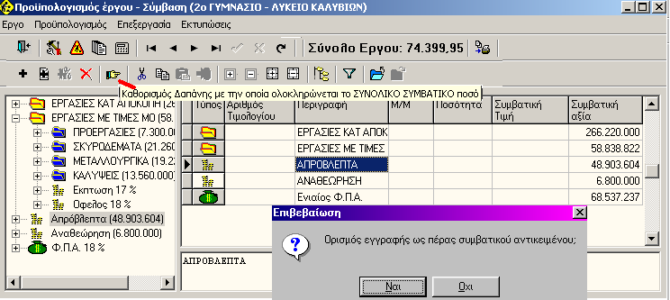 Αφού ολοκληρώσουμε την εισαγωγή όλων των στοιχείων του προϋπολογισμού και επιβεβαιώσουμε ότι το τελικό ποσό (Σύνολο έργου) είναι όπως εμφανίζεται και στη σύμβαση τότε πατάμε το πλήκτρο