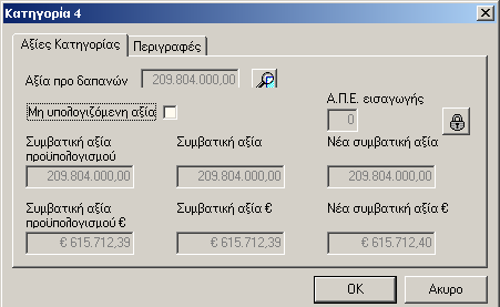 Στο παράθυρο αυτό μπορούμε να δούμε την συνολική δαπάνη και άλλα ποσά που καθορίζουν την κατηγορία. Την περιγραφή κάθε κατηγορίας θα την ορίσουμε ή στη υποσελίδα "Περιγραφές" ή απευθείας στο κάτω μέρος του παραθύρου του προϋπολογισμού.