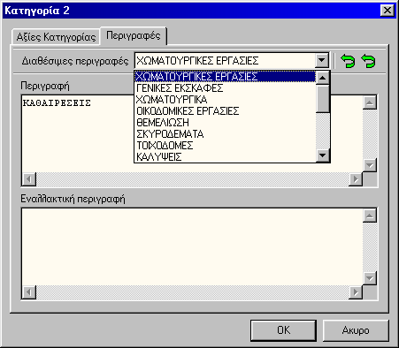Στο παράθυρο "Περιγραφές μπορούμε να ορίσουμε την περιγραφή της κατηγορίας και εναλλακτική περιγραφή (π.χ. σε άλλη γλώσσα) . Μπορούμε να επιλέξουμε -συνθέσουμε περιγραφή(ες) από έτοιμες περιγραφές από το σχετικό παράθυρο. Τα περιγραφές-κείμενα αυτά είναι καταχωρημένα στα "κείμενα έργων" με κωδικό "ΠΕΡΙΓΡΑΦΗ ΚΑΤΗΓΟΡΙΩΝ"
