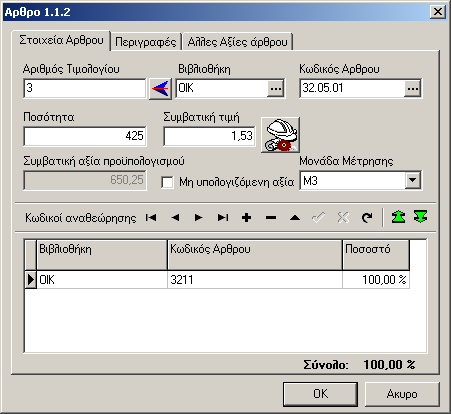 Με την επιλογή αυτή ενημερώνουμε το παράθυρο με α) την περιγραφή του άρθρου. β) την μονάδα μέτρησης του άρθρου και τέλος τον κωδικό (ους) αναθεώρησης του άρθρου