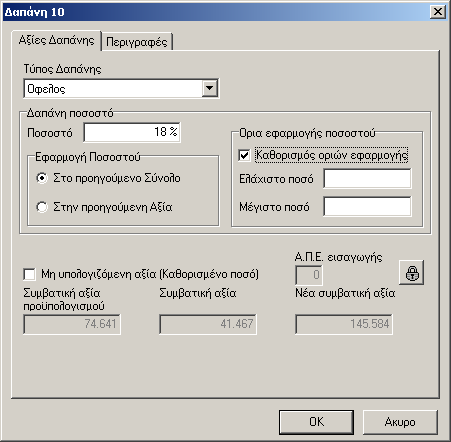 Επίσης μπορούμε να καθορίσουμε όρια εφαρμογής του ποσοστού δηλαδή από ή μέχρι ποιό ποσό θα εφαρμοστεί (π.χ. όταν έχουμε μεταβλητό Γ.Ε. & Ο.Ε. σε έργα με μερική χρηματοδότηση από Δημ. Επενδύσεις.)