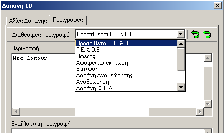 Στο παράθυρο "Περιγραφές μπορούμε να ορίσουμε την περιγραφή της δαπάνης και εναλλακτική περιγραφή (π.χ. σε άλλη γλώσσα) . Μπορούμε να επιλέξουμε -συνθέσουμε περιγραφή(ες) από έτοιμες περιγραφές από το σχετικό παράθυρο. Τα περιγραφές-κείμενα αυτά είναι καταχωρημένα στα "κείμενα έργων" με κωδικό "ΠΕΡΙΓΡΑΦΗ ΔΑΠΑΝΩΝ"