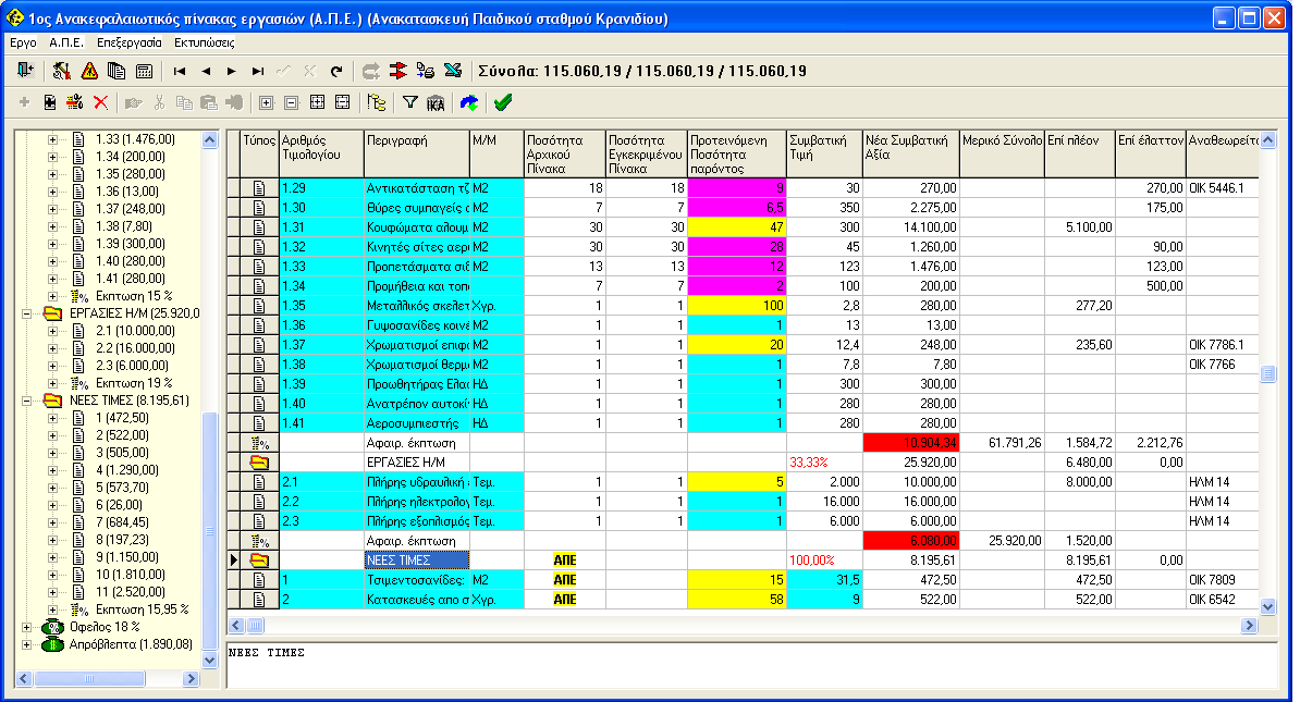 Αμέσως εμφανίζονται οι μεταβολές (με σχετικό χρώμα) και στη κορυφή του παραθύρου βλέπουμε τα τελικά ποσά από τον Προϋπολογισμό, τον Προηγούμενο εγκεκριμένο ΑΠΕ και τον προτεινόμενο ΑΠΕ