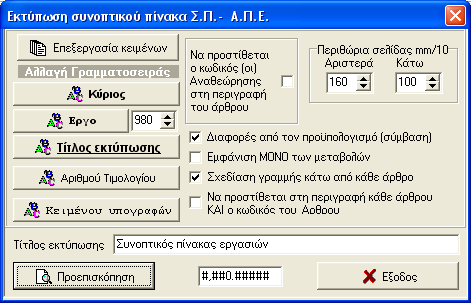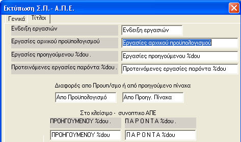 Στην Υποσελίδα «Τίτλοι» μπορούμε να αλλάξουμε τα λεκτικά των στηλών κ.λπ, της εκτύπωσης