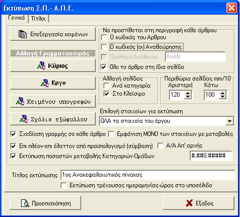 Μπορούμε να επιλέξουμε για εκτύπωση Όλα τα στοιχεία ή Διάφορες άλλες επιλογές όπως: