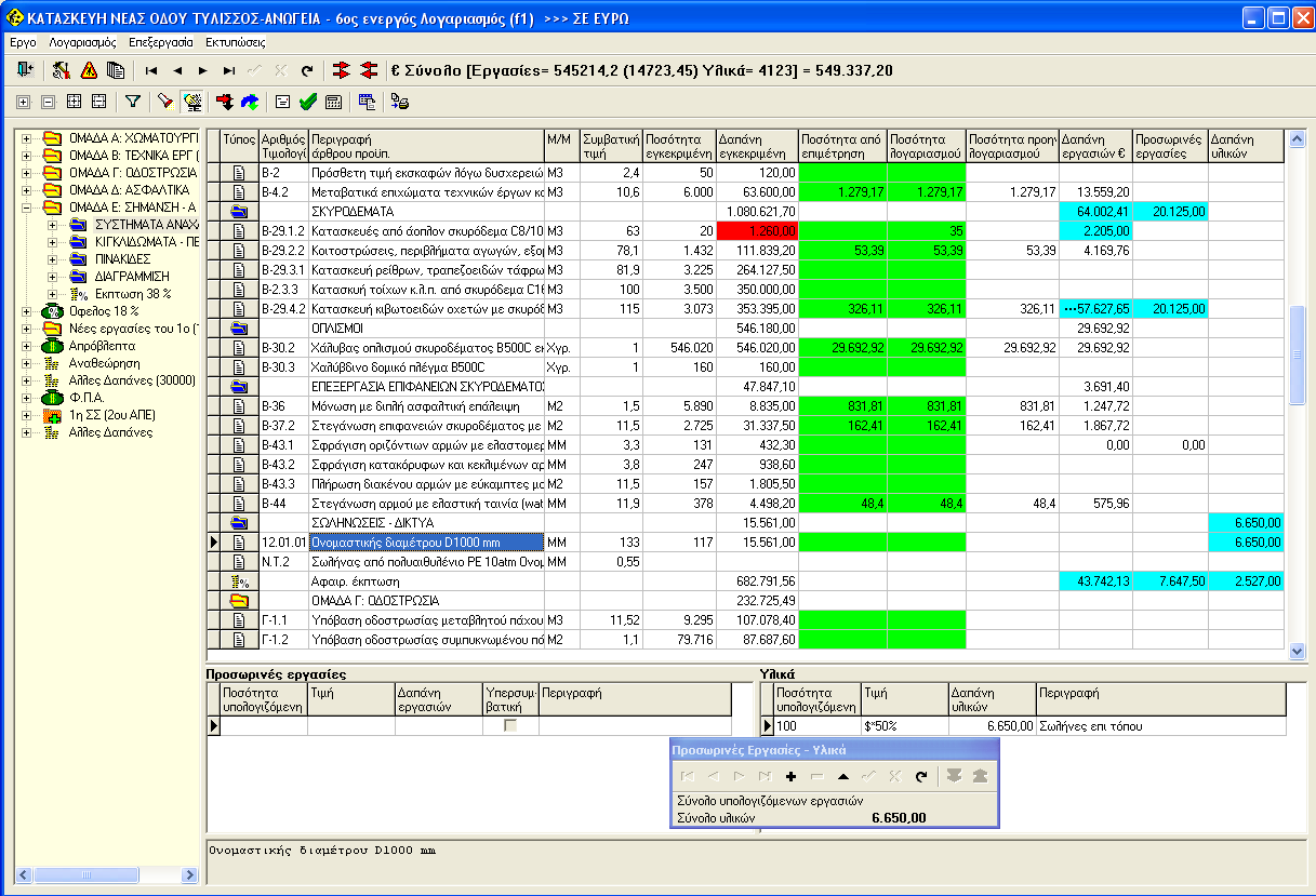 Ολες οι δαπάνες υπολογίζονται άμεσα είναι ορατές σε διαφορετικές στήλες (Πλήρως εκτελεσμένες εργασίες, προσωρινές-ημιτελείς, δαπάνη υλικών) πάντα με σχετικά χρώματα που μας βοηθούν στη επεξεργασία.