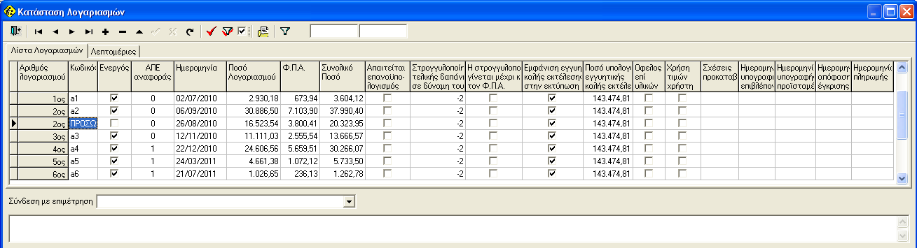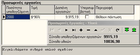 Στο κάτω αριστερό μέρος μπορούμε να ορίσουμε (πολλές και για κάθε άρθρο), ποσότητες και τιμές είτε σε απόλυτο ποσό ή με αναλυτικό τρόπο (πράξη) ή με ποσοστό. Τμήματα εκτέλεσης από Προσωρινές ή μη περαιωμένες εργασίες. Μπορούμε να ορίσουμε ακόμα και σχετική περιγραφή για κάθε εγγραφή.