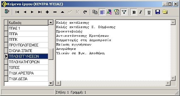Μπορούμε να ορίσουμε διαφορετικές περιγραφές για τις εγγυήσεις (η βασική έννοια δεν αλλάζει) βάζοντας στα «Κείμενα έργου» Κωδικό «ΤΙΤΛΟΙ ΕΓΓΥΗΣΕΩΝ» και γράφοντας τους τίτλους π.χ.