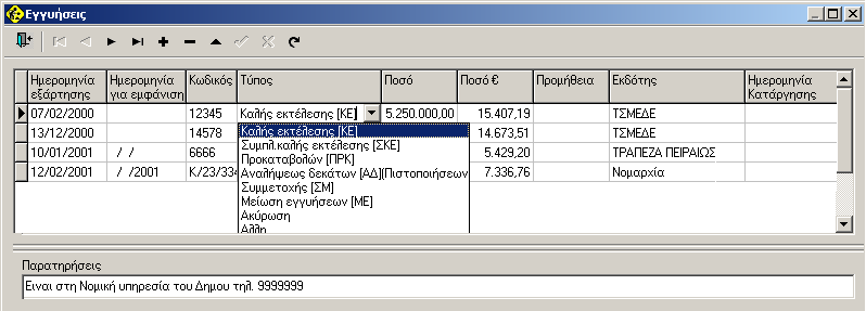 Η λίστα είναι αποθηκευμένη στα Βασικά «Κείμενα έργων» (Παράμετροι εφαρμογής) με κωδικό «ΕΚΔΟΤΗΣ ΕΓΓΥΗΣΕΩΝ»