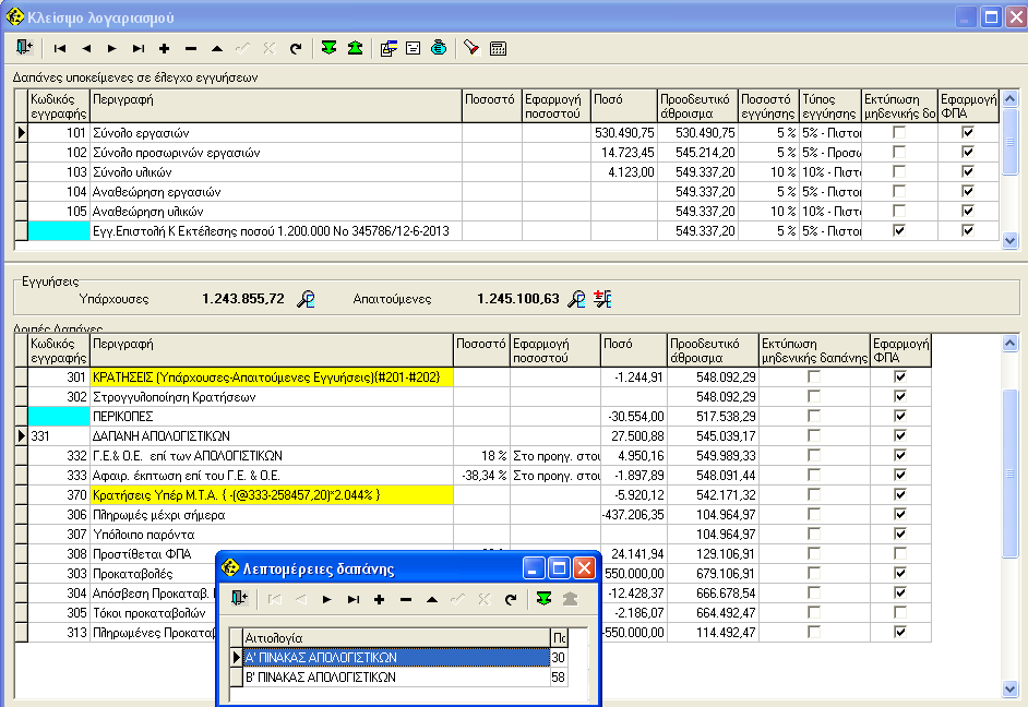 Βλέπουμε δύο τμήματα. Στο πάνω τμήμα Ορίζουμε δαπάνες που γενικά υπόκεινται σε έλεγχο εγγυητικών ενώ στο κάτω δεν γίνεται κανένας έλεγχος εγγυήσεων.