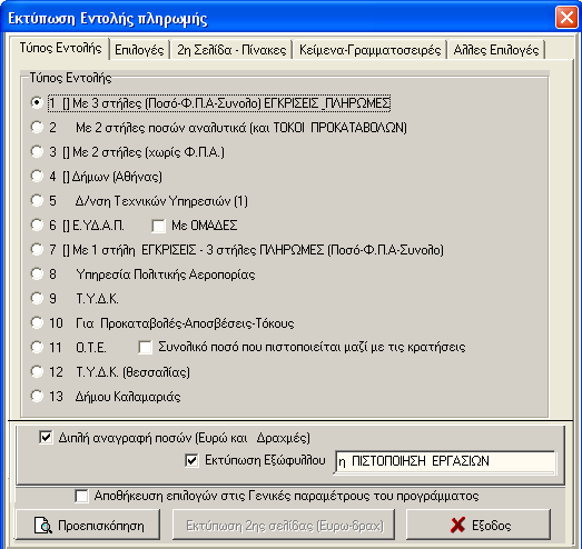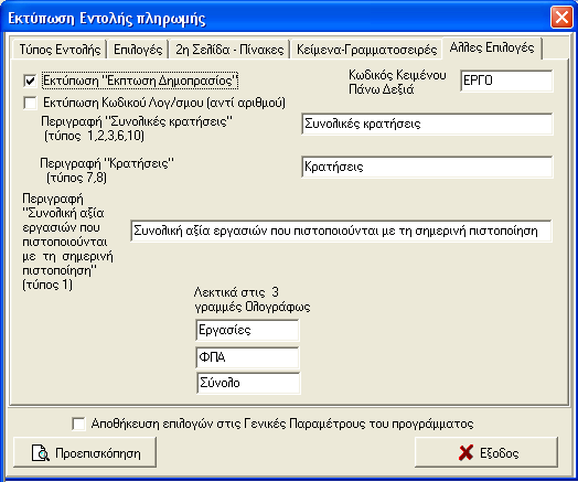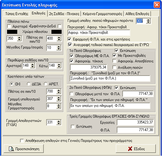Μπορούμε να ορίσουμε αν και τι θα εμφανίζεται ολογράφως σε 2 διαφορετικά πλαίσια. Το ποσό, αν θα περιλαμβάνει ΦΠΑ, διάφορες επιλογές που αφορούν προκαταβολές -αποσβέσεις -τόκους (εφ' όσον έχουν οριστεί στο έργο) καθώς και το σχετικό λεκτικό πριν από την αναγραφή του ποσού ολογράφως. Αφού επιλέξουμε «εκτύπωση» κάνουμε και διαφορές άλλες επιλογές