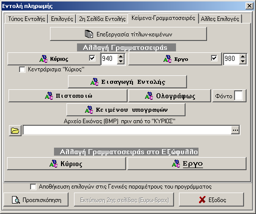 Η επιλογή Εκτύπωση τίτλων μας δίνει τη δυνατότητα τα τυπωθούν στη πρώτη σελίδα ο «ΚΥΡΙΟΣ» και το «ΕΡΓΟ» και με τα ομότιτλα σχετικά πλήκτρα να αλλάξουμε τη σχετική γραμματοσειρά.