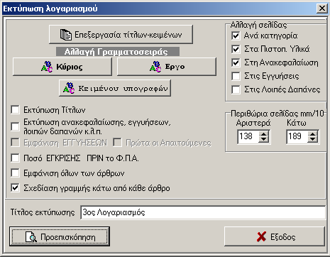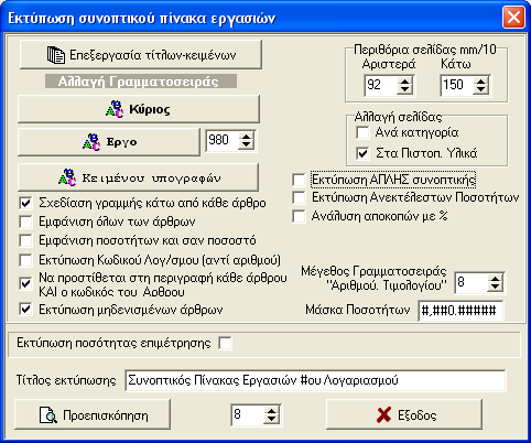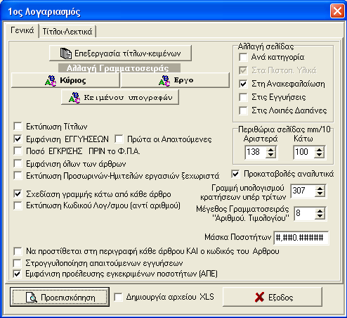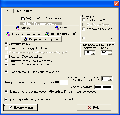 Η επιλογή Εκτύπωση τίτλων μας δίνει τη δυνατότητα τα τυπωθούν στη πρώτη σελίδα ο «ΚΥΡΙΟΣ» και το «ΕΡΓΟ» και με τα σχετικά πλήκτρα να αλλάξουμε τη σχετική γραμματοσειρά.