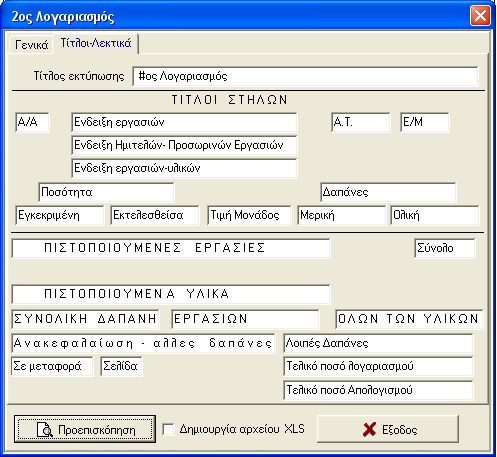 Στη σελίδα Τίτλοι -Λεκτικά μπορούμε να αλλάξουμε τα λεκτικά σε διάφορα μέρη της εκτύπωσης