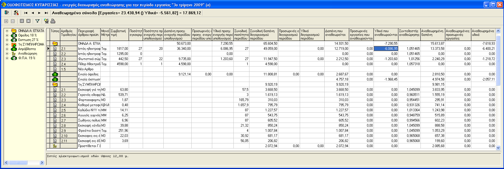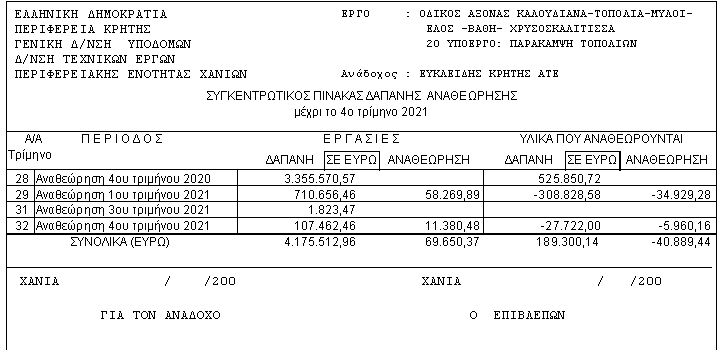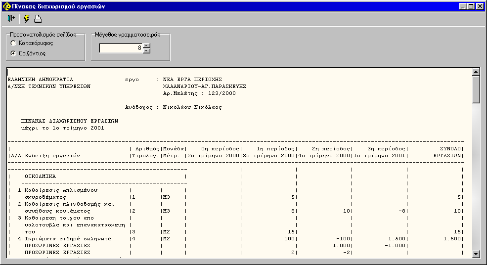Στη πρώτη επιλογή παίρνουμε μια αναλυτική εκτύπωση για την δαπάνη εργασιών υλικών και τις αντίστοιχες δαπάνες αναθεώρησης για κάθε τρίμηνο.(μέχρι το τρίμηνο που έχουμε τοποθετηθεί.)