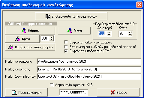 Τέλος μας δίνεται η δυνατότητα να δημιουργήσουμε αρχείο "XLS" . Αφου τσεκάρουμε τη σχετική επιλογή στο κάτω μέρος και στο κέντρο του σχετικού παράθυρου επιλογών της εκτύπωσης και πατήσουμε "Προεπισκόπιση» ανοίγει ο διάλογος γα το όνομα και τη θέση που θα δημιουργηθεί το αρχείο XLS του αναλυτικού υπολογισμού αναθεώρησης τριμήνου που θα παραχθεί και θα φορτωθεί αμέσως στο excel μετά τη προεπισκόπηση της εκτύπωσης