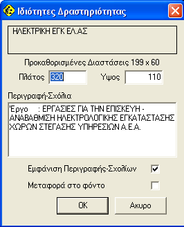 Ορίζουμε επίσης τις διαστάσεις πλαισίου σχεδίασης κάθε Δραστηριότητας. Με αυτές οι τιμές θα σχεδιαστούν όλα τα πλαίσια (εκτός και αν έχουμε καθορίσει εμείς άλλες τιμές για κάποιο συγκεκριμένο πλαίσιο)