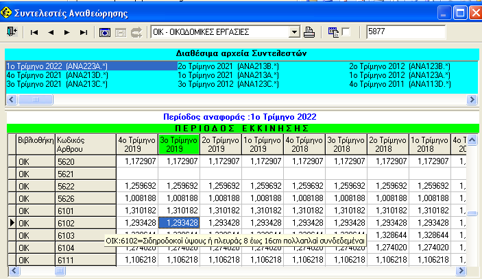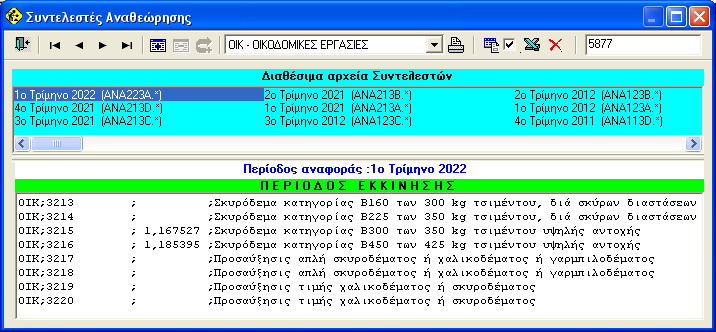 Στο πάνω μέρος της οθόνης εμφανίζονται όλα τα αρχεία συντελεστών αναθεώρησης με χαρακτηριστικό όνομα το τρίμηνο (περίοδο) εκτέλεσης των εργασιών που περιλαμβάνουν ΌΛΕΣ τις εκκινήσεις (από 2ο Τρίμηνο 1992). Στο κάτω μέρος έχουμε σε στήλες όλες τις εκκινήσεις. Μπορούμε να αναζητήσουμε κάποιο κωδικό πληκτρολογώντας στα σχετικά πεδία (στη γραμμή με τα πλήκτρα ) την βιβλιοθήκη και τον κωδικό που αναζητούμε. Όταν Αλλάζουμε από το πάνω τμήμα του παράθυρου το Τρίμηνο των συντελεστών το κάτω μέρος θα εξακολουθεί να παραμένει στο άρθρο και στο τρίμηνο εκκίνησης που είχαμε προηγουμένως τοποθετηθεί.